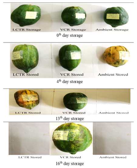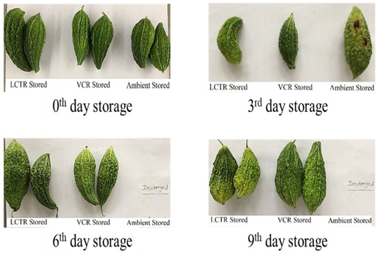 Based on the score assigned to crops on a daily basis and visual appearance, it was concluded that bitter gourd stored in LCTR, VCR, and ambient conditions had an acceptability of 7, 9, and 3 days, respectively. Similarly, the acceptability of okra, mango, and papaya were as follows; okra (LCTR 8; VCR 10; ambient store 4), mango (LCTR 10; VCR 16; ambient store 6), and papaya (LCTR 12; VCR 16; ambient store 4). The decrease in acceptability was due to the growth of fungus and blackish colour in bitter gourd and okra, and the ripening of mango and papaya, whereas crops stored in LCTR and VCR were in an enclosed chamber and under hygienic conditions, which prevented the external attack from microorganisms.