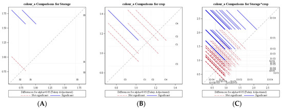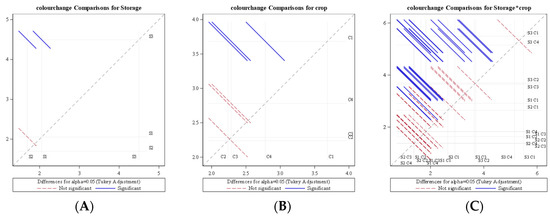 Diffogram showing the effect of storage condition and crop on average daily colour change. (A) Colour change comparison for storage (B) Colour change comparison for crop (C) Colour change comparison for storage*crop S1—LCTR; S2—VCR; S3—ambient storage; C1—bitter gourd; C2—okra; C3—mango; C4—papaya.