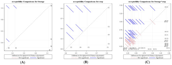 Diffogram showing the effect of storage condition and (B) crop on average daily change of overall acceptability. (A) Acceptability comparison for storage (B) Acceptability comparison for crop (C) Acceptability comparison for storage*crop S1—LCTR; S2—VCR; S3—ambient storage; C1—bitter gourd; C2—okra; C3—mango; C4—papaya.