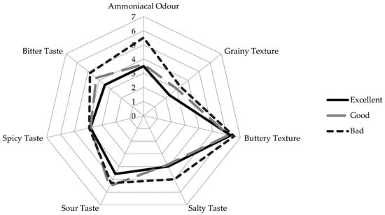 Radar graphic presenting some of the quantitative descriptive analysis (QDA) descriptors: odour (ammoniacal), texture (grainy and buttery) and taste (salty, sour, spicy and bitter) of cheese sensory characteristics. The cheeses belonging to the same sensory group (“Excellent”, “Good” or “Bad”, defined by the specialised trained panel scores) were grouped and the results were expressed as mean.