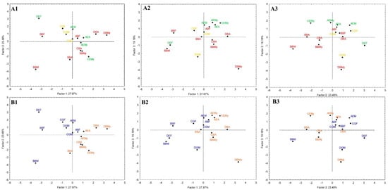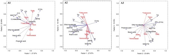 The projection of the variables in the three planes constituted by the three principal components is shown in Figure 3. The first three principal components explained 70.6% of the total variance. As can be seen in Figure 3A1–A3, the first component (PC1) by itself condensed 28.0%, the second component (PC2) explained 23.5% of the total variance and the third component (PC3) explained 19.2% of the total variance. Therefore, the similarity map defined by the first two principal components (PC1 vs PC2) accounted for 51.5% of the total variance, PC1 vs PC3 accounted for 47.2% of the total variance and PC2 vs PC3 took into account 42.7% of the total variance. The PC1 presented negative correlations with C4—butyric acid (r = −0.66), Tyr (r = −0.63), 2-undecanone (r = −0.62), ethyl isovalerate (r = −0.79), C12 (r = −0.64) and NPN/TN% (r = −0.78) (Figure 3A1,A2); the PC2 presented negative correlations with C3—propionic acid (r = −0.79) and positive correlations with Trp, iC5 (r = 0.57) and G’1Hz, (r = 0.66) (Figure 3A1,A3); and the PC3 presented negative correlations with Ile (r = −0.70), MFFB (r = −0.79) and WSN/TN% (r = −0.92) (Figure 3A2,A3).