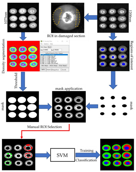 The correction process of the original image was carried out in SpectraVIEW (Isuzu Optics, China). After correction, a blueberry grayscale image was obtained and saved. Then, the image was imported into the Environment for Visualizing Images (ENVI) (Exelis Visual Information Solutions, Boulder, CO, USA) for further processing. According to previous scientific literature [49], the border between blueberries and the background was obvious at 1075 nm, and the blueberry damage area was darker than the healthy area at 1200 nm.