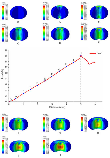 Blueberry load–distance curve and finite element simulation. Blueberry is compressed from O–J. The letters from O,A represent the stress state of blueberry at different compression distances, respectively. O: uncompressed blueberry; A: compression distance is 0.5 mm; B: compression distance is 1 mm; C: compression distance is 1.5 mm; D: compression distance is 2 mm; E: compression distance is 2.5 mm; F: compression distance is 3 mm; G: compression distance is 3.5 mm; H: compression distance is 4 mm; I: compression distance is 4.5 mm; J: compression distance is 5 mm.