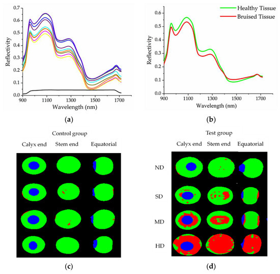 Spectral curve image of blueberries and hyperspectral classification image of each damage stage. The spectral curves of blueberries and background plate (a), the black curve is the background plate and the other color curves are the different positions on the blueberry fruit. The spectral curves of blueberry healthy tissue and damaged tissue (b). Hyperspectral classification images of the control group (c) and test group (d).