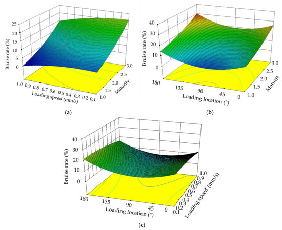 Response surface of influencing factors. Response surface for the effect of loading speed and maturity on bruising rate (a), response surface for the effect of loading position and maturity on bruising rate (b), and response surface for the effect of loading position and loading speed on bruising rate (c).