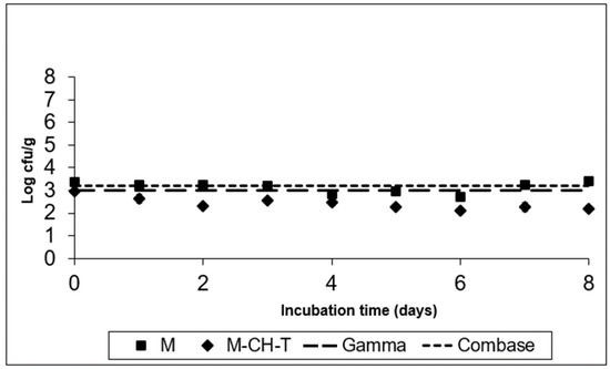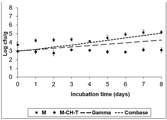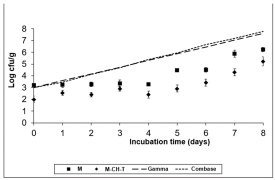 The Gamma model best predicted the behavior of L. monocytogenes and S. enterica during storage at 4 °C. However, L. monocytogenes growth in both treatments M and M-CH-T fell under the predictions of the two models at 8 °C. This could be due to the fact that during model development, factors such as interactions between pathogens and members of the spoilage microflora, the structure/composition of the product, etc. are not taken into consideration [45]. On the other hand, the experimental results obtained for Salmonella at 8 °C for treatment M did not seem to correlate with the predicted values of the Gamma model, as the actual time required to reach the predicted levels of the pathogens was shorter than the time estimated by the model. In another study, the time required to reach 106 CFU/g counts of L. monocytogenes during the storage of chicken nuggets at 10 °C was half the value predicted by the predictive model used [46]. Parameters such as the temperature during storage, the head space gas composition and pH, as well as the background microflora during actual storage of the inoculated samples, may lead to differences between predictive and real-time results [46].