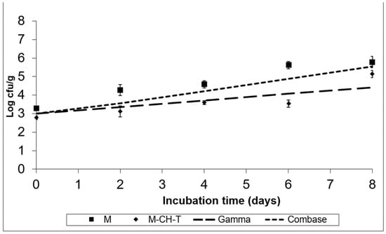 Figure 3 and Figure 4 show the fate of S. Montevideo inoculated in treatments M and M-CH-T, stored at 4 °C and 8 °C, respectively. Using the Gamma model, it was predicted that Salmonella spp. could not grow at low chilled temperatures (4 °C), although it could survive during the product’s preservation. According to calculations based on the Combase® model, the growth of this microorganism was inhibited at 4 °C. However, at 8 °C (Figure 4), the Gamma model showed a growth of ca. 1.4 log CFU/g at the end of the time of storage, whereas Combase® estimated a higher growth, reaching a ca. 2.5 log CFU/g increase at the end of the storage period. From the comparison of the two models, a difference of 1.1 log CFU/g in the final predicted counts of Salmonella was obtained.