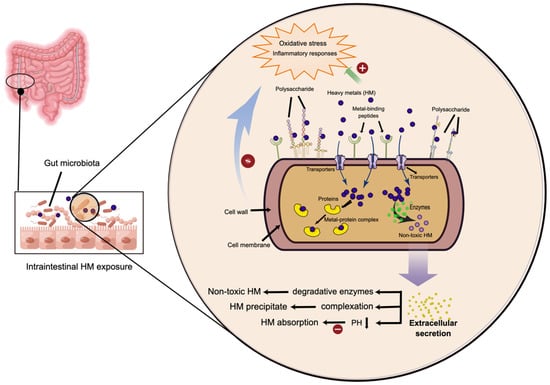 Within the human intestinal tract, there are large populations of bacteria performing a decisive role in HM absorption and metabolism. In most cases, transforming toxic metals into biologically inaccessible forms is a prime mechanism underlying the HM-metabolizing capabilities of probiotics. This is exemplified in the findings that some potential probiotic strains Xanthomonadaceae, Comamonadaceae, Pirellula, Cloacibacterium, and Deltaproteobacteria FAC87 convert methylated Hg to the less soluble form Hg0, which reduces its absorption in the gastrointestinal tract [95,105]. Likewise, Lactobacillus plantarum (L. plantarum) TW1-1 has been found to convert Cd into a less absorbable form that is poorly incorporated in the alimentary canal [23]. During the process, the methylation of HMs is a pivotal step to metabolize HMs into lower solubility, which was proved in the cases of sulfate-reducing bacteria (SRB), Fe-reducing bacteria, methanogens, and Desulfovibrio spp. [79]. Furthermore, it is an intriguing finding that the treatment of L. plantarum CCFM8610 and CCFM8661 in mice increased the production and excretion of bile acids, meanwhile enhancing the elimination of HMs from the mice intestine [23,24]. In addition, L. plantarum LC-705 and Propionibacterium freudenreichii have been shown to inhibit the absorption of Pb and Cd by decreasing the intestinal PH [106].