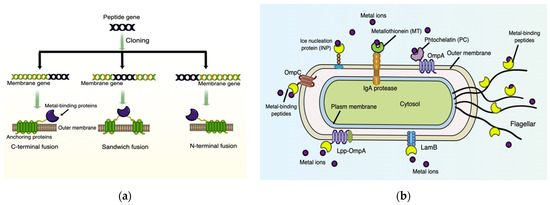 Biosorption is a metabolism-independent process by which metal ions can be adsorbed and immobilized onto the cell surface via physicochemical reactions or surface precipitation [83]. Recently, the application of molecular biology has enabled the display of foreign metal-binding proteins/peptides or other tailor-made binding proteins on the cell surface to exhibit enhanced HM biosorption. The basic principle of different bacterial display systems is fusing the heterogenous HM-binding proteins (target protein) with naturally occurring anchoring proteins (carrier protein) via three connection approaches, C-terminal fusion, N-terminal fusion, or sandwich fusion (Figure 2a), but meanwhile maintaining the independent spatial structure and biological activity of both proteins [137].
