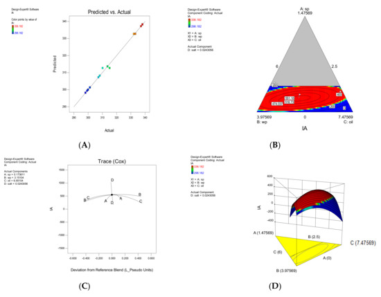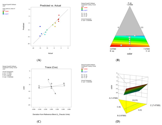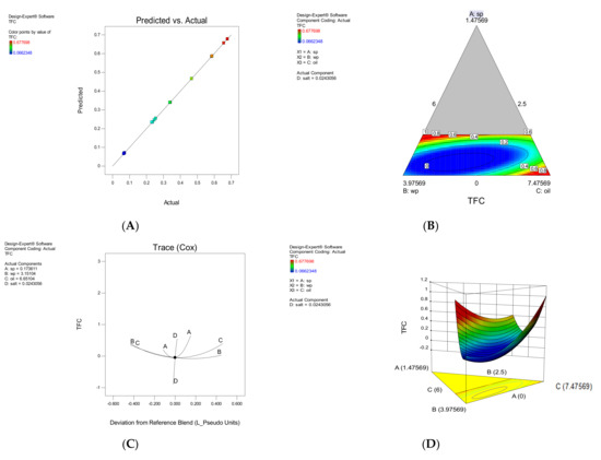 According to Table 3, the independent variables A, B and C and the interaction of BD, CD, ABC, ABD and ACD had a significant effect on the TAC response (p < 0.05). The effect of each parameter on TAC is shown in Figure 2. The amount of total anthocyanin increased with increasing the amount of SP, decreasing the amount of SWP, and decreasing the amount of oil in the snack coating, because this microalgae is rich in anthocyanins [17,20]. Oil along with SP did not have a favorable effect on the amount of TAC. TAC, on the other hand, increased with a decrease in SWP and an increase in SP. It has an additive effect on TAC, and the presence of salt has a negative effect (Figure 2A). The software is accurate and reliable, so it is clear from the validation chart that the model developed is effective and robust in predicting performance.