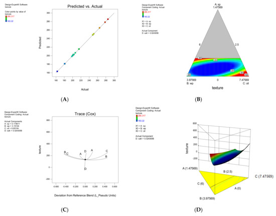 The effect of each parameter on texture (TX). The correlation between experimental and approximated values (A), Contour plot (B), Trace plot (C), three-dimensional response surface plot (D).