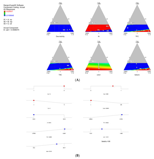 Using the optimization method, the desired values for each variable for the final product were obtained. In this study, 16-Run, 5 factors were investigated by designing D-optimal mixture design to determine the optimal formulation of independent variables and observe the responses. Each of the measured responses (dependent variables) was assigned to special cubic and quadratic models. Analysis of variance was used to determine the significance level of the models. For a more detailed look at the role of mixed parameters in the present study, three-dimensional diagrams of 3D Surface, contour and trace plots were used. According to Equation (7) 1, 2, 3 and 4, respectively, are SP, SWP, oil and salt as independent variables and β1 and βu are the lowest and highest levels of variables, respectively. If β1 = β2 = β3 = β4, it is a simple design; otherwise, optimum mixture and in the next stage the responses were determined that included TAC, Color (C), Texture (TX), AI and TFC, and in the next stage the correlation rate and finally the statistical optimization were obtained based on the desirability rate, the desired sample was selected, the total desirability was obtained and the performance was calculated.