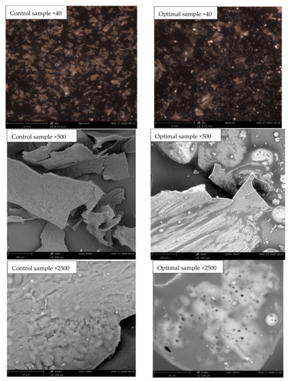 SEM micrographs of the control and optimal samples at different magnifications.