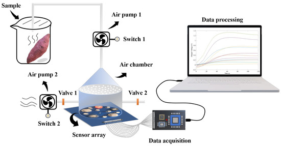 E-nose was self-assembled by the agricultural products storage laboratory of Zhejiang A&F University in Hangzhou, China. As shown in Figure 1, it consisted of an electromechanical control unit, a sensor array, and a data acquisition unit. The volume of the air chamber was 350 mL. The sensor array consisted of 12 metal oxide sensors and one temperature and humidity sensor to monitor environmental temperature and humidity. The metal oxide sensors were purchased from Figaro Engineering Corporation, Japan. The models of the sensor were TGS2620, TGS826, TGS822, TGS832, TGS813, TGS816, TGS2600, TGS2610, TGS2611, TGS2615, TGS2602, and TGS2603, numbered S1, S2, S3, S4, S5, S6, S7, S8, S9, S10, S11, and S12, respectively. The temperature and humidity sensor HTU20 was purchased from the Humirel company, France, and numbered S13. The sensitive gases of each sensor are shown in Table S1.