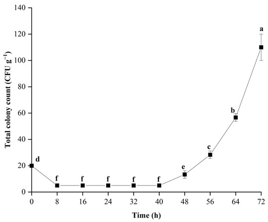 The number of pathogens is an important factor affecting disease in sweetpotatoes. The growth curve of C. fimbriata in sweetpotatoes is shown in Figure 2. From 0 to 72 h, the total colony count showed a stable trend at first and then increased. Fungi growth can be divided into three phases: the lag phase, the exponential phase, and the stationary phase [42]. C. fimbriata exhibited a long lag phase (0 to 40 h) and entered the exponential phase from 48 h. The longer the infection time, the faster the growth rate. The total colony count was in a low stable state from 8 to 40 h, which indicated that the C. fimbriata needed to re-adapt to the new environment in the early period of inoculation [43] and begin synthesising enzymes, coenzymes, or intermediate metabolites necessary for growth. During that time, the total colony count did not increase significantly (p > 0.05). From 48 to 72 h, the spores of C. fimbriata began to proliferate, resulting in a rapid and significant increase in total colony count.