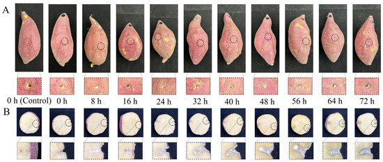 Pathological disease process of sweetpotatoes inoculated with C. fimbriata from 0 to 72 h. (A) Surface disease symptoms. (B) Internal disease symptoms.