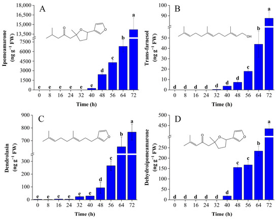 The trends of (A) ipomeamarone, (B) trans-farnesol, (C) dendrolasin, and (D) dehydroipomeamarone from 0 to 72 h in C. fimbriata-infected sweetpotatoes. Bars represent the standard deviations of three independent measurements. Different lowercase letters represent significant differences according to Duncan’s multiple range test (p < 0.05).