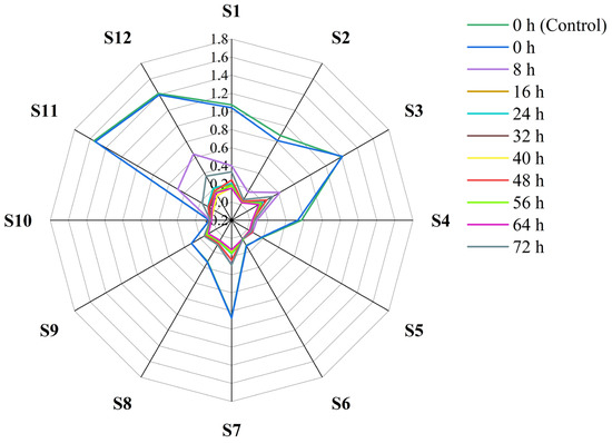The response signal of each sensor from 0 to 120 s was selected. The response curves of different sensors are shown in Figure S1. After the exponential growth, the sensor had a sufficient response to volatile compounds and reached equilibrium, so the response signal of the sensor reached a steady state in the later stage. During sample measurement, the response signal (V) of each sensor varied with the volatile compounds of sweetpotatoes. It can be seen from Figure 6 that the response signal of sensor S10 was the lowest, followed by S5 and S6. The response signal of sensors S1, S3, S7, S11, and S12 changed the most in different periods, followed by sensors S2, S4, S8, and S9, indicating that these nine sensors were more sensitive to the volatile compounds of sweetpotatoes.