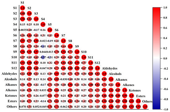 HS-SPME/GC–MS mainly focuses on the identification and quantification of a single substance and is highly sensitive and accurate. However, its high operating cost and required personnel input limit its widespread practical application in agriculture [49]. E-nose is economical, fast, non-destructive, and capable of batch analysis. According to the results of HS-SPME/GC–MS, the content of volatile compounds in C. fimbriata-infected sweetpotatoes changed greatly from 40 to 72 h due to the proliferation of C. fimbriata. Therefore, a correlation analysis between E-nose and HS-SPME/GC–MS from 40 to 72 h was performed, and the results are shown in Figure 7. Table S1 showed the reported sensitive substance of the sensor array in E-nose. Sensors S1 (r = 0.62, p < 0.05) and S3 (r = 0.63, p < 0.05), which were reported to be sensitive to organic solvents, showed high correlations with aldehydes. S5 (r = 0.72, p < 0.05), S8 (r = 0.94, p < 0.05), and S9 (r = 0.61, p < 0.05), which were reported to be sensitive to alkanes, also showed correlations with alkanes in this study. S11 was reported to be sensitive to volatile organic compounds, and its correlation with aldehydes, alkanes, alkenes, ketones, and esters was 0.85, 0.80, 0.72, 0.68, and 0.71, respectively, in the present study. S6 was reported to be sensitive to alkanes, but we found that it also had a high correlation with aldehydes (r = 0.97, p < 0.05) and alcohols (r = 0.85, p < 0.05). Although the volatile compounds, including ammonia, amine series, and organic sulfur, were not detected by HS-SPME/GC–MS, sensors S2 and S12 showed responses to these substance in sweetpotatoes. Simultaneously, S2 and S12 had a high correlation with other volatile compounds in sweetpotatoes. The correlations between S2 and aldehydes, aldehydes, alkanes, alkenes, ketones and esters were 0.89, 0.78, 0.76, 0.71, and 0.73, respectively. The correlations between S12 and aldehydes, aldehydes, alkanes, alkenes, ketones, and esters were 0.83, 0.82, 0.71, 0.69, and 0.73, respectively. S4, S7, and S10 had low correlations with various volatile compounds. These three sensors were reported to be sensitive to freon and hydrogen, but these two volatile compounds were not detected by HS-SPME/GC–MS. So, then, the sensors (S4, S7, and S10) showed low correlations with freon and hydrogen in the present work.