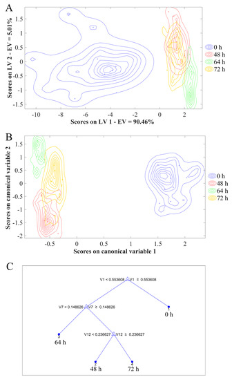 First, PCA was used to analyse C. fimbriata-infected sweetpotatoes from 0 to 72 h. It can be seen from Figure 8 that the first and second PCs explained 89.5% and 6.1% of the variance in the input variables, respectively, with a total of 95.6%. The first two PCs can be considered as comprehensive information for the representation of entire samples [50]. The samples of the C. fimbriata-infected group and the control group at 0 h showed a large amount of overlap. This indicated that the volatile compound contents of fresh sweetpotatoes and C. fimbriata-infected sweetpotatoes were mostly the same at 0 h, which was consistent with the results of HS-SPME/GC–MS. Based on the results of the two flavor-detection techniques, it can be considered that the C. fimbriata-infected group and the control group had the same freshness at 0 h. The fresh samples at 0 h were well distinguished from the infected samples from 8 to 72 h. However, C. fimbriata-infected sweetpotatoes from 8 to 72 h were indistinguishable. This was probably because the volatile compound contents did not change significantly in the early period of inoculation. Therefore, four distinguishable time points were screened out: 0 h, 48 h, 64 h, and 72 h. Three models were used to discriminate C. fimbriata-infected sweetpotatoes at different infection times: PLS-DA, LDA, and CART.
