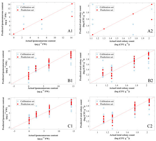 The predicted ipomeamarone content and total colony count based on E-nose data. (A1,A2) KNN model of (A1) ipomeamarone and (A2) total colony count. (B1,B2) PLS model of (B1) ipomeamarone and (B2) total colony count. (C1,C2) PCR model of (C1) ipomeamarone and (C2) total colony count.