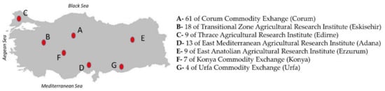 A total of 125 winter wheat varieties harvested during the 2018–2019 growing period in rainfed conditions were obtained from different experimental farms located in Turkey (Adana, Çorum, Edirne, Erzurum, Eskişehir, Konya, Urfa) (Figure 1). Wheat samples (~2 kg) were milled on a Buhler laboratory mill (BreakMill SM 3, Brabender Ohg Duisburg, Germany) equipped with a 0.5 mm sieve after purging any impurities by sieving. Flour samples were kept in plastic bags and properly stored at refrigerator temperature (+4 °C) until experiments. All measurements were performed in duplicate.