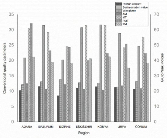 The effect of region on the correlation between GlutoPeak indices and conventional quality parameters was also portrayed in Table 1. Among the seven regions, Adana, Konya, Edirne, and Erzurum demonstrated a negative strong correlation in descending order (r = −0.782, r = −0.747, r = −0.687, r = 0.659, p < 0.05) between PMT and WGC values of flours, while Corum demonstrated a negative moderate correlation (r = −0.511, p < 0.05). The MT GlutoPeak indices of flour samples from Edirne produced a very strong positive correlation with both PC (r = 0.890, p < 0.05) and WGC (r = 0.825, p < 0.05), which are important conventional quality parameters. Additionally, MT of flour samples from Eskisehir, Erzurum, and Corum had positive strong correlations both with PC (r = 0.736, r = 0.690, and r = 0.626, respectively, p < 0.05) and WGC (r = 0.652, r = 0.753, and r = 0.694, respectively, p < 0.05). These very strong and strong correlations have been supported by previous findings, suggesting that the MT value is a critical parameter to differentiate protein quality of whole wheat flour samples [8,12,17]. Among GlutoPeak indices, AM value provides a foresight about glutenin content which is responsible for the elasticity of the gluten network. Therefore, higher AM values are associated with higher degrees of crosslinking, increased dough elasticity, and gluten strength [19]. In this study, it was determined that AM value had a positive strong correlation with both PC (r = 0.626, p < 0.05) and WGC (r = 0.694, p < 0.05) in Corum, while it demonstrated a positive moderate correlation with PC (r = 0.529, p < 0.05) in Erzurum and with SV (r = 0.492, p < 0.05) in Edirne. Although PM value does not have as strong of a discrimination power as other GlutoPeak parameters, such as MT and PMT, the PM value has a strong correlation with the gluten strength of whole wheat flours [12]. PM value of flour samples from all regions demonstrated positive very strong (r = 0.908 for Edirne, p < 0.05), strong (r = 0.785 for Edirne, r = 0.768 for Eskisehir and r = 0.627 for Konya, p < 0.05), and moderate correlations (r = 0.573 for Corum, p < 0.05) with PC, except Adana. Only in the Urfa region, a negative very strong correlation (r = −0.850, p < 0.05) between PM and PC was observed. The flour samples from the Erzurum, Edirne, Eskisehir, and Corum regions produced very strong (r = 0.821 for Erzurum, p < 0.05) and strong correlations (r = 0.778 for Edirne, r = 0.744 for Eskisehir and r = 0.652 for Corum, p < 0.05) in descending order between GlutoPeak PM index and conventional WGC parameters. Overall, protein contents (which are primary determinants of wheat quality) of whole wheat flour samples have been significantly affected by environmental conditions (temperature, humidity, climatic changes, growing seasons etc.). Therefore, correlations between GlutoPeak and conventional properties of whole wheat flour samples from different regions (in rainfed conditions at about 21–24 °C) demonstrated a range from moderate to very strong correlations due to their changing protein contents and gluten qualities.