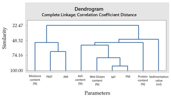 In Table 2, the eigenvalues of each variable and their ratios to explain the total change are reported both individually and cumulatively. In HCA dendogram (Figure 3), vertical lines indicate the distance between the clusters when they are combined, which means that longer branches suggest lesser similarity while shorter branches suggest higher similarity. The HCA dendogram highlighted that wet gluten content among traditional gluten quality parameters indicated the highest positive similarity (78%) with MT and PM GlutoPeak indices. The HCA dendogram had 95% specificity and 100% sensitivity.