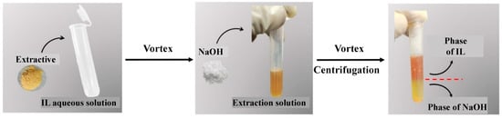 The purification of extracted solution from M. charantia was determined using method with minor modifications [12]. Figure 1 illustrates the process flow combining extraction and purification of total saponins from M. charantia by IL-based ABS-based high hydrostatic pressure extraction. A total of 0.5 g M. charantia powder was added to the aqueous solution of IL ([C4MIM]BF4) according to a certain ratio of material to solvent. After vortexing at room temperature, a certain concentration of sodium hydroxide was added, and continued to vortex until the two phases were separated. Subsequently, centrifuging for 5 min at 1800× g, the sodium hydroxide-rich lower phase was completely isolated from the IL-rich upper phase.