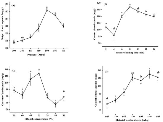 Effect of pressure (A), pressure-holding time (B), ethanol concentration (C) and material to solvent ratio (D) on the output of total saponins for HHP extraction. Values are means of triplicate ± standard deviation. Different letters represent significant differences (p < 0.05).