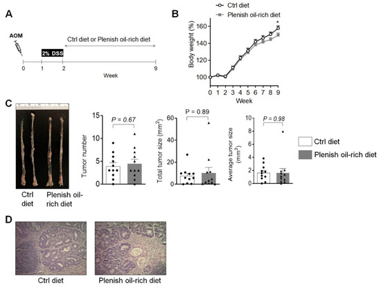We stimulated C57BL/6 mice with AOM and DSS to induce colon tumorigenesis, then treated the mice with the control diet or Plenish oil-rich diet (see scheme of the animal experiment in Figure 1). After AOM/DSS treatment, the mice treated with Plenish oil-rich diet had slightly reduced body weight: at the end of the experiment (9 weeks post the AOM injection), the body weight of the mice, expressed as relative weight compared with the mouse weight at t = 0, were 157.8 ± 2.7 (mean ± SEM) % vs. 149.7 ± 2.5% (p < 0.05) for control group and Plenish oil group, respectively (Figure 1B).