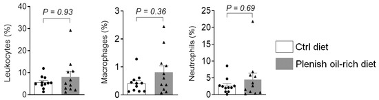 In terms of colon tumorigenesis, we found that the control diet and the Plenish oil-rich diet had similar effects on development of AOM/DSS-induced colon tumorigenesis in mice (Figure 1C,D). The tumor number, total tumor burden, and average tumor size of for control group vs. Plenish oil group was 3.9 ± 0.8 (mean ± SEM) vs. 4.5 ± 1.0 (p = 0.67), 7.6 ± 2.3 vs. 10.3 ± 5.0 (p = 0.89), and 1.6 ± 0.4 vs. 1.6 ± 0.7 (p = 0.98), respectively (Figure 1C).