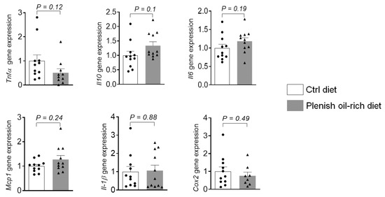 We also analyzed the expression of inflammatory genes in colon tissues (Figure 3). Compared with the control diet, treatment with Plenish oil-rich diet did not significantly alter the expression of a series of genes that are important in inflammation, including Tnf-α, Il-10, Il-6, Mcp-1, Il-1β, and Cox-2 (Figure 3). These genes encode the expression of proteins that are critical for inflammation and colon tumorigenesis [25]. For example, substantial studies have shown that Cox-2, which mediates the expression of cyclooxygenase (COX-2), plays critical roles in the pathogenesis of colon cancer [26]. Overall, these results support that Plenish oil-rich diet did not have a significant effect on tumor-associated colonic inflammation compared with the control diet.