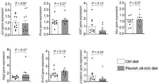 We also analyzed the expression of tumor-associated markers [27]. Treatment with Plenish oil-rich diet had no significant influence on the expression of Jun, Pcna, Ki67, Myc, Vegf, Axin2, and β-catenin (Figure 4), supporting that Plenish oil-rich diet did not significantly affect the on expression of tumor markers in colon tissues. Together, these results support that the Plenish soybean oil and traditional soybean oil have similar effects on development of colon cancer in mice.