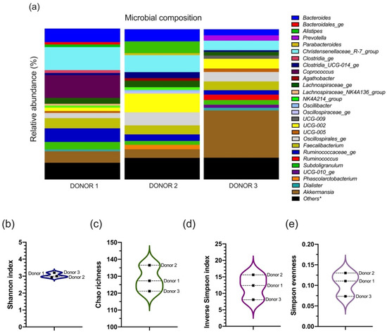 Microbial community analysis in stool samples from donors 1, 2, and 3, as assessed using 16S rRNA Illumina Sequencing. (a) Genera abundance histogram (%, left panel) and genus classification (right panel) based on quality-controlled OTU reads. Only bacterial genera with relative abundance >1% in at least one sample are shown, and the rest are included as others * (see details in Supplementary File S2, Table S2). Diversity analysis of the sequencing data is presented as (b) Shannon α-diversity index, (c) Chao estimator of genus richness, (d) Simpson reciprocal α-diversity index, and (e) Simpson abundance-derived evenness.