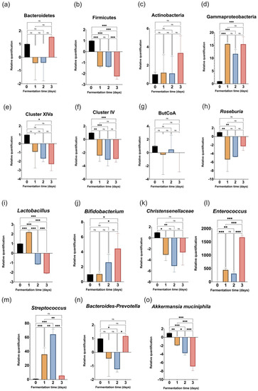 The Lactobacillus genus increased during the first day of incubation, but after that, it significantly decreased (Figure 2i). In contrast, Bacteroides-Prevotella (Figure 2n) and its phylum Bacteroidetes (Figure 2a) were identified only by the end of the fermentation (third day). However, these last two taxa were not quantified at statistically important levels when compared with the fecal inoculum.