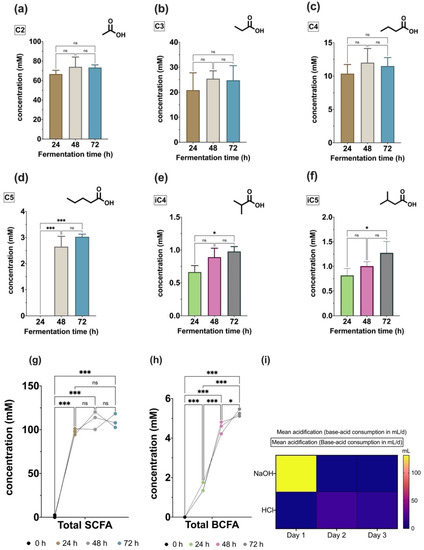 Production of short-chain fatty acids (SCFA) and branched-chain fatty acids (BCFA) and acidification during the in vitro fermentation. Concentrations are expressed in mM for: (a) C2: acetate, (b) C3: propionate, (c) C4: butyrate, (d) C5: valerate, (e) iC4: isobutyrate, (f) iC5: isovalerate, (g) total quantification of SCFA, and (h) BCFA, all quantified using SPME-GC-MS. (i) Recorded consumptions (mL/day) of base (NaOH) and acid (HCl). Data are presented as mean ± SD, and statistical significances (one-way ANOVA comparisons, followed by Bonferroni’s post-test) are shown as p < 0.05 (*), p < 0.001 (***), and p > 0.05 (ns).