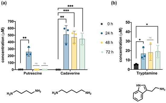 Microbiota-derived production of (a) putrescine and cadaverine and (b) tryptamine. Data are expressed as mean ± SD. Statistically significant differences evaluated using one-way ANOVA comparisons followed by Bonferroni’s post-test are indicated as p < 0.05 (*), p < 0.01 (**), p < 0.001 (***), and p > 0.05 (ns).