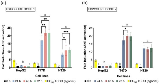 - AhR_T47D and AhR_HepG2 cells were seeded (3.0 × 105 cells/mL) and incubated overnight in white clear-bottomed 96-well plates, and later exposed to the fermentation samples for 24 h. For the luminescence reading, cells were rinsed with PBS, and 50 µL/well of lysis solution containing Triton X100 were added. The plates were frozen at −20 °C for two hours to boost the lysis, and finally, 50 µL/well of glow-mix containing luciferin (Promega, Madison, WI, USA) and ATP (Roche Diagnostics, Rotkreuz, Switzerland) were added.
