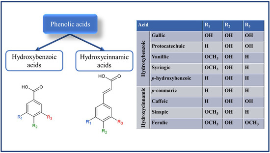 Phenolic acids contain a phenolic ring and an organic carboxylic acid function, with a maximum absorption at 280 nm for the C6–C1 skeleton of hydroxybenzoic acid derivatives (gallic, protocatechuic, p-hydroxybenzoic, vanillic, and syringic acids) and 320 nm for the C6–C3 skeleton of hydroxycinnamic acid derivatives (p-coumaric, ferulic, caffeic, sinapic, chlorogenic and cinnamic acids). In addition, the phenolic ring can stabilize and displace unpaired electrons, imparting an antioxidant property to phenolic acids [17]. The biosynthesis of phenols is derived from several biosynthetic precursors, including some amino acids such as phenylalanine and tyrosine, acetate, pyruvate, malonyl Co, and acetyl CoA through metabolic pathways involving phenylpropanoid, shikimic acid, and pentose phosphate [18].