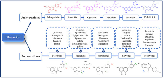 Phenolic acids include hydroxybenzoic (gallic, protocatechuic, vanillic, syringic) and hydroxycinnamic (coumaric, caffeic, sinapic, ferulic) acids. In addition to hydroxybenzoic and hydroxycinnamic acids, hydroxyphenylacetic and hydroxyphenylpropanoic acids can be found in pseudocereals [19,20]. On the other hand, flavonoids comprise many compounds, especially anthoxanthines (flavonols, flavones, flavanols, flavanones and isoflavonoids), anthocyanidins, and anthocyanins. Some examples of flavonoids are (i) anthocyanidins (cyanidin, petunidin, pelargonidin, delphinidin, peonidin, malvidin) or anthocyanins when glycosylated on C3, forming C3-O-glucoside; (ii) flavonols (quercetin, kaempferol, myricetin, galangin, and fisetin); (iii) flavones (apigenin, chrysin, luteolin, isocinencitin, cinencetin, tangeritin, and nobiletin); (iv) flavanols (catechin, epicatechin, epigallocatechin, epicatechin gallate, and epigallocatechin-gallate); (v) flavanones (eriodictyol, naringenin, phloretin, pinocembrin, and hesperidin) [21]; and (vi) isoflavonoids (genistein, genistin, daidzein, tetrahydrodaidzein, glycitein, formononetin, (S)-Equol, biochanin A, 8 prenylgenistein, pueranin, genistin-6-O-malonate, and genistin-6-O-acetate) [22].