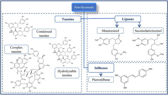 Phenolic compounds are phytochemicals found in fruits, vegetables, algae, legumes, pulses, cereals, and pseudocereals. They are secondary metabolites with the primary function of protecting the plant against adverse effects arising from both biotic factors (insects, microorganisms, rodents, and birds) and abiotic factors (humidity, temperature, ultraviolet solar radiation, and nutrients) [9,16]. The phenolic compounds are phenolic acids (Figure 1), flavonoids (Figure 2), and non-flavonoids (stilbenes, chalcones, lignans and tannins) (Figure 3). Tannins are composed of the hydrolysable fraction comprising the esters from ellagic acid (ellagitannins) or gallic acid (gallotannins). The condensed fraction of tannins is comprised of polymeric proanthocyanidins.