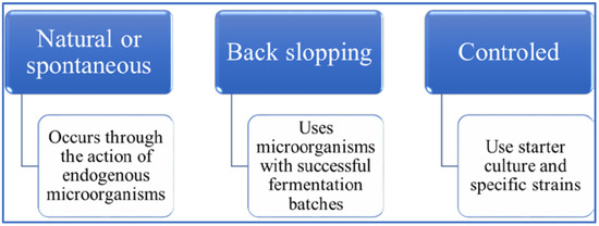 Fermentation comprises conventional techniques (Figure 4) involving the conversion or modification of substrates promoted by the metabolic activity of specific microorganisms. This microbial action promotes positive appearance, color, flavor, texture, technological functionalities, nutritional composition, nutrient bioavailability, and physiological effects. In addition to compounds beneficial to the diet, fermentation may also be responsible for reducing compounds that are harmful to human health [54].
