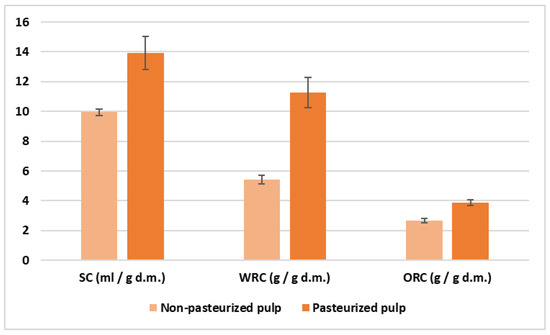 The physicochemical properties analyzed, that is, swelling, water retention and oil retention capacities (SC, WRC and ORC, respectively), were higher (p < 0.05) in PP than in NPP (Figure 1), showing better hydration properties and capacity to bind oil of PP. This last property makes this pasteurized by-product suitable to stabilize fat-rich food and emulsions. Thus, pasteurization can improve the technological aptitude of orange pulp.