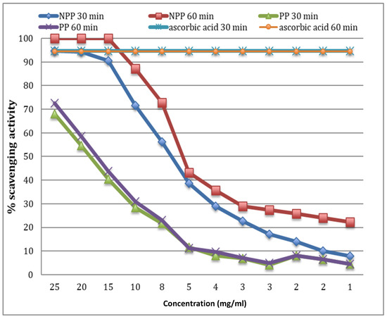 TPC of the samples were similar (NPP: 5.72 ± 0.21; PP: 5.44 ± 0.13 mg gallic acid/g d.m). However, Agcam et al. [31] observed an enhancement of the total phenolic concentration after heat pasteurization treatments. Furthermore, two different assays were performed in order to address the antioxidant capacity of both samples, namely, FRAP and DPPH. These two methods had been suggested as appropriate by numerous authors for measuring the antioxidant activity of fruit juice extracts, and therefore should be accurate for orange pulp [32]. FRAP was higher (p < 0.05) in NPP (62.33 ± 3.22 µg Trolox/g d.m.) than in PP (46.58 ± 2.16 µg Trolox/g d.m.). Furthermore, the scavenging activity on DPPH radical was tested in a range of concentration from 1 mg/mL to 25 mg/mL and compared with the activity of ascorbic acid at 30 and 60 min (Figure 2). The DPPH was totally scavenged for NPP at concentrations ranged 25–20 mg/mL, and greater than 90% at 15 mg/mL. However, the scavenging activity was 68% at 25 mg/mL for PP, and it was less than half (40.4%) at 15 mg/mL. The half maximal effective concentration (EC50) was minor (p < 0.05) for NPP (9.2 mg/mL at 30 min and 6.7 mg/mL at 60 min) than for PP (18.5 mg/mL at 30 min and 17.4 mg/mL at 60 min). Therefore, the antioxidant power of NPP is higher than in PP indicating a loss of activity as a negative effect during the pasteurization. It is remarkable that the antioxidant activity decrease is not due to vitamin C and/or extractable polyphenols because these compounds are not significantly diminished after pasteurization. Oliveira et al. [33] observed that pasteurized peaches presented similar amounts of total phenolics, but an increase of their antioxidant activity; maybe due to a major availability of carotenoids and the formation of new products. Bhattacherjee et al. [34] reported similar amounts of vitamin C and total polyphenol contents in pasteurized aonla juice; however, they observed changes in individual antioxidant compounds. Jeong et al. [35] observed that thermal treatment of citrus peels can liberate bound phenolics, leading to an increase in the total phenolic content (TPC) after the processing. Thus, pasteurization degrades some components but improves the availability of others and can generate new compounds, different from those in the fresh samples, mainly through reactions such as the Maillard reaction.