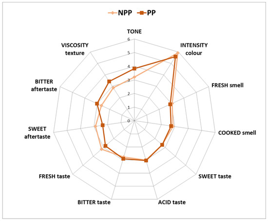 Radial chart about the sensorial attributes of non-pasteurized pulp (NPP) and pasteurized pulp (PP) evaluated by sensory panel.