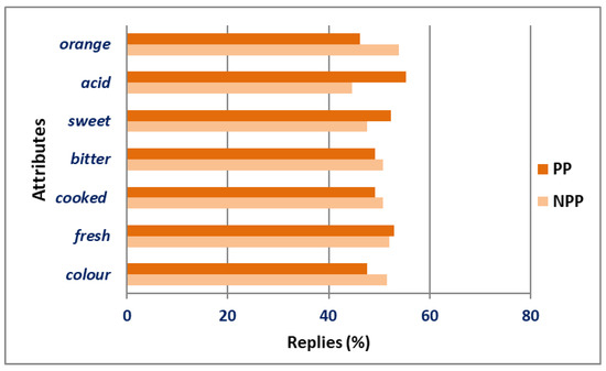 The discriminative test performed consisted of presenting the two samples to the panelists, and asking them to identify which of the two samples had an outstanding attribute over the other sample, such as which of the two samples was more acidic. Figure 4 represents the percentages of replies related to the evaluated attributes (similar to orange fruit, acidity, sweetness, bitterness, similar to cooked flavor, freshness, and similar to orange color). Among the evaluated attributes, the panelist were only able to discriminate two, namely, lower acidity and similarity to orange fruit in the case of NPP. The other attributes were not well differentiated by the panelists, but this was to be expected because the panelists were not trained in this type of analysis. In fact, this untrained panel was used because we sought feedback from regular consumers to see the possibilities of using the pasteurized ingredient for food production without affecting the expected sensory characteristics. In the affective part of the sensory analysis, panelists preferred the color (59%), smell (56%) and taste (62%) of NPP.