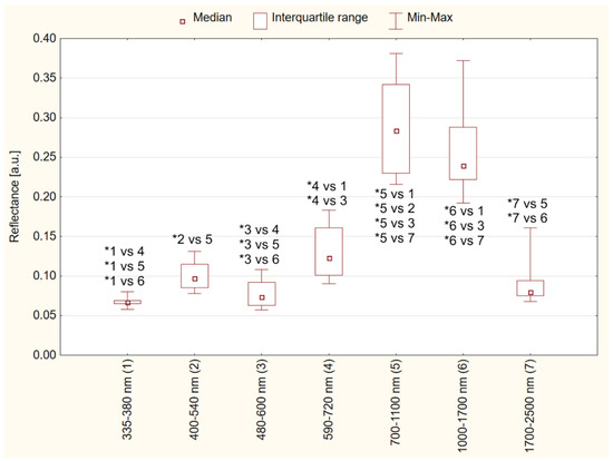 The chocolate reflectance values differed significantly depending on the wavelength ranges (p ≤ 0.001, the results of the post hoc test are shown in Figure 2). The lowest values of chocolate reflectance occurred at the wavelengths of 335–380 nm (median 0.067), 400–540 nm (median 0.097), 480–600 nm (median 0.074) and 1700–2500 nm (median 0.080). The highest reflectance values occurred in the wavelength range of 700–1100 nm (median 0.284) and 1000–1700 nm (median 0.239). Intermediate reflectance values occurred at a wavelength of 590–720 nm (median 0.123). Due to the lack of a normal distribution, the standard deviation was not used as a measure of the spread, but the median and quartile range values were given, which are appropriate for this type of data.