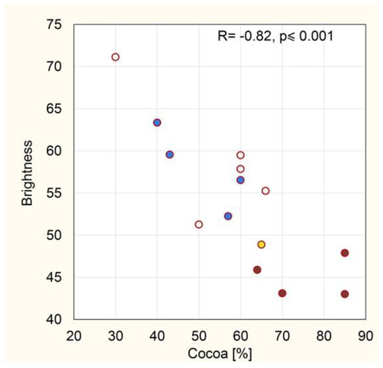 The cocoa content in the tested chocolate ranged from 30% to 85%, and the median was 60% (Figure 3, Table 2). The brightness of the chocolate ranged from 43.0 to 71.1 with a median value of 53.7. There is a significant statistical correlation between the cocoa content and the brightness of the chocolate (Figure 3). The lower the cocoa content, the brighter the color of the chocolate (R = −0.82, p ≤ 0.001).