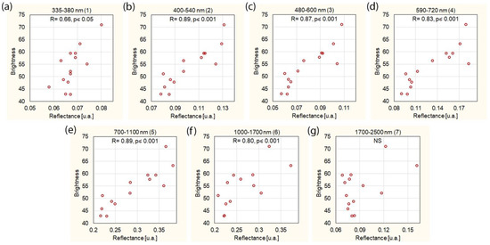 Correlation between chocolate brightness and reflectance for different wavelength ranges: (a) 335–380 nm, (b) 400–540 nm, (c) 480–600 nm, (d) 590–720 nm, (e) 700–1000 nm, (f) 1000–1700 nm, (g) 1700–2500 nm. NS—not significant.